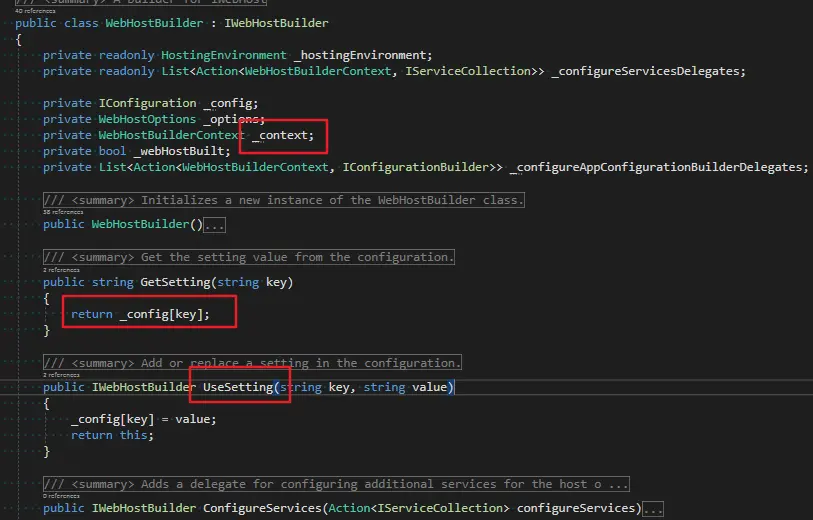 那么WebHostBuilder创建出来后, 里面有两个缓存, 对startup的类型进行缓存之外, 还对startup的services进行缓存. 然后这个builder显然是要进行 build 的, 不然费那么大力气创建干嘛. 所以看下一篇吧, 解读后续操作.