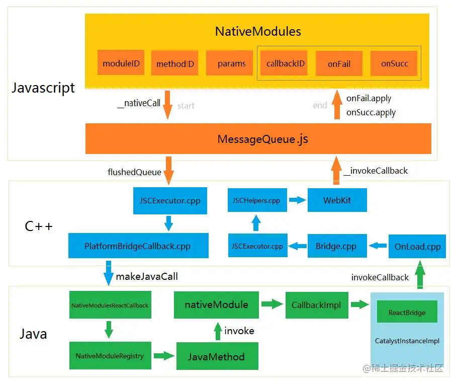 - Java层:java层就是app原生代码,C++层的javascript解析器javascriptCore来执行js代码,从而构建原生UI等。java层依赖于众多优秀开源库,在图片处理使用的是Fresco,网络通信使用的是okhttp,在java层原生的功能均封装为Module,如Toast和Log等。