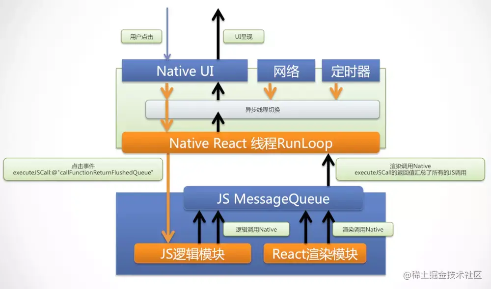 - Js层:处理事件分发及UI Layout,平常开发最常用的。通用jsx来写业务代码,通过flexbox来实现布局。