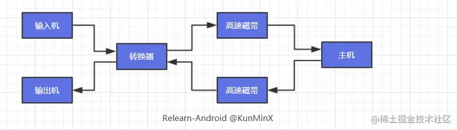 所以可以理解为,高速磁带就是内存的雏形,由转换器将输入输出设备的数据转换并读写在高速磁带上。这样,主机并不直接与慢速的输入输出设备打交道,而是与高速的磁带发生关系,如此便 有效缓解了主机与外设的矛盾。