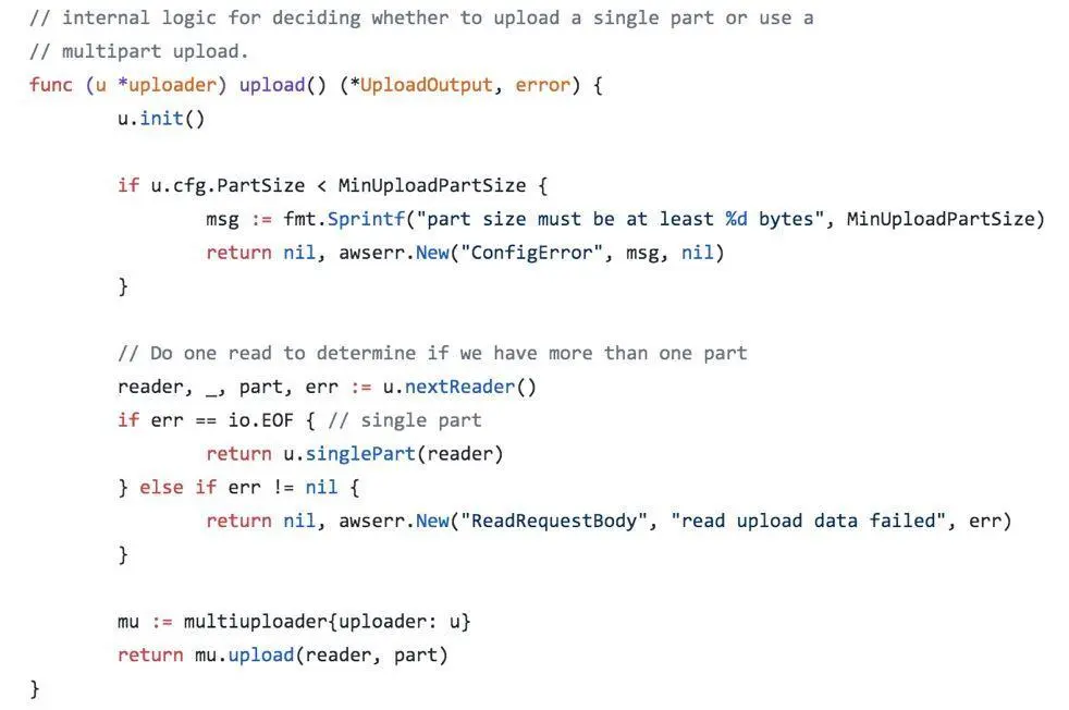 可以看到,与前面PutObject不同,这里使用s3manager.NewUploader来构造上传服务,通过uploader.Upload方法上传文件。Upload的具体实现逻辑可以参考源码: