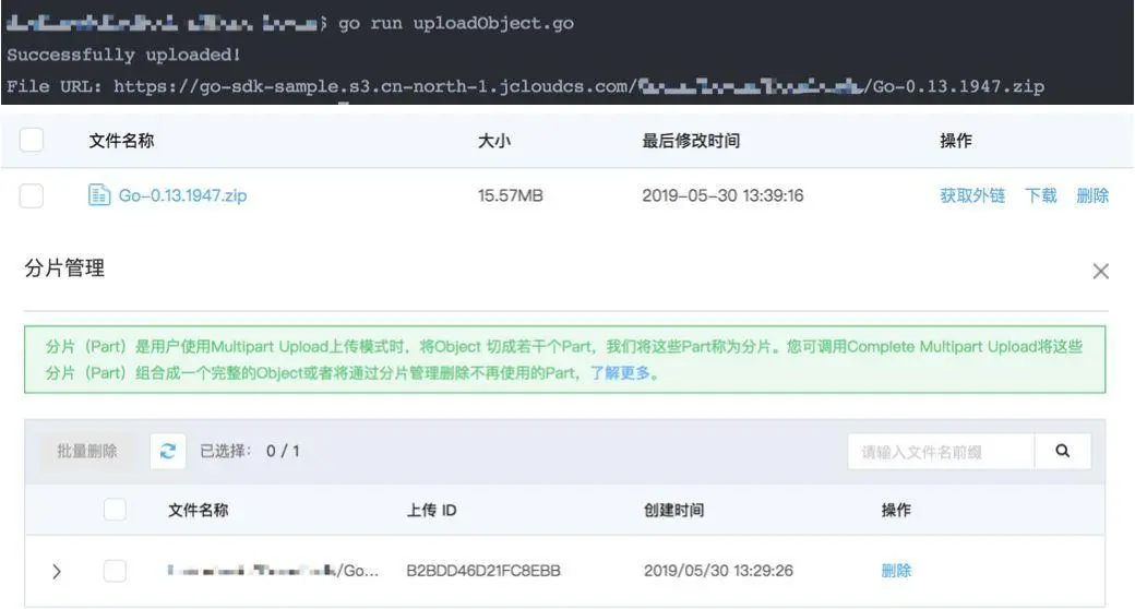 本次上传的文件大小为16M,比PartSize的10M大,因此会执行分块上传。在上传过程中,可以在控制台-分片管理看到对应正在上传的分片任务,说明正在分片上传。upload的上传成功后会返回文件访问地址location。