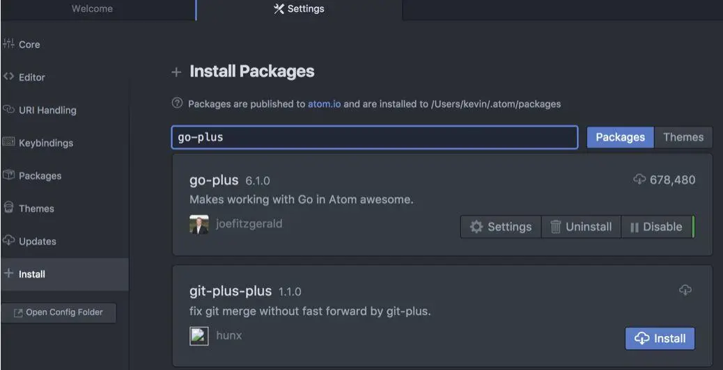 3、安装go-plus插件 go-plus是Atom上面的一款开源的Golang开发环境插件,项目地址: github.com/joefitzgera…