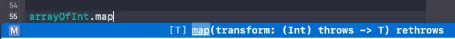 上面的代码看着有点冗余。它包含创建一个新数组的样板代码,我们可以通过使用 map 来避免。我们通过 Swift 的自动补全功能可以看到 map 函数接受有一个 Int 类型的参数并返回一个泛型的闭包。