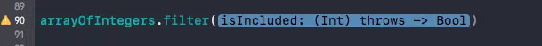 如你所见, filter 函数调用了一个接受一个 Int 类型参数、返回值为 Bool 类型、名字为 isIncluded 的闭包。isIncluded 在每次遍历都会返回一个布尔值,然后基于布尔值将创建一个新的包含筛选结果的数组。