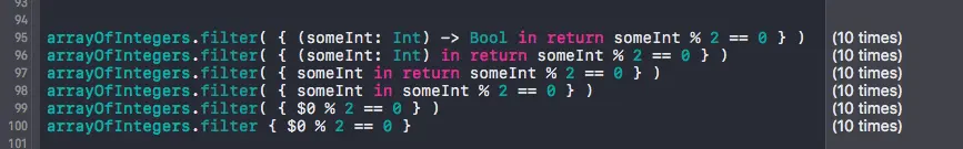 如果我们对整形数组使用 filter ,Swift 的自动补全展示如下: