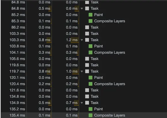 时间差了一点不过影响不大,会发现paint和render事件消失了,可以证明transform确实是不会触发重绘其实除了我写的这处区别外在performance控制台还有好几处区别,具体的大家可以自己试一哈