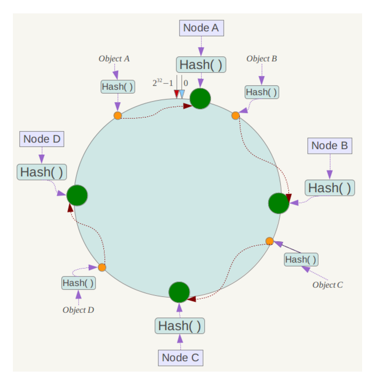 从此位置沿环顺时针“行走”,第一台遇到的服务器就是其应该定位到的服务器。也就是说Object A定位到Node A,Object B定位到Node B,Object C定位到Node C,Object D定位到Node D。