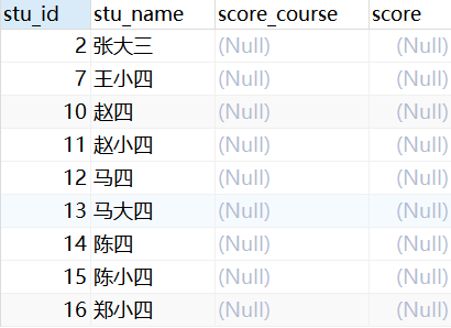 select s.stu_id,s.stu_name,c.score_course,c.score from tb_student s left join tb_score c on s.stu_id = c.score_stu_id where c.score is null;