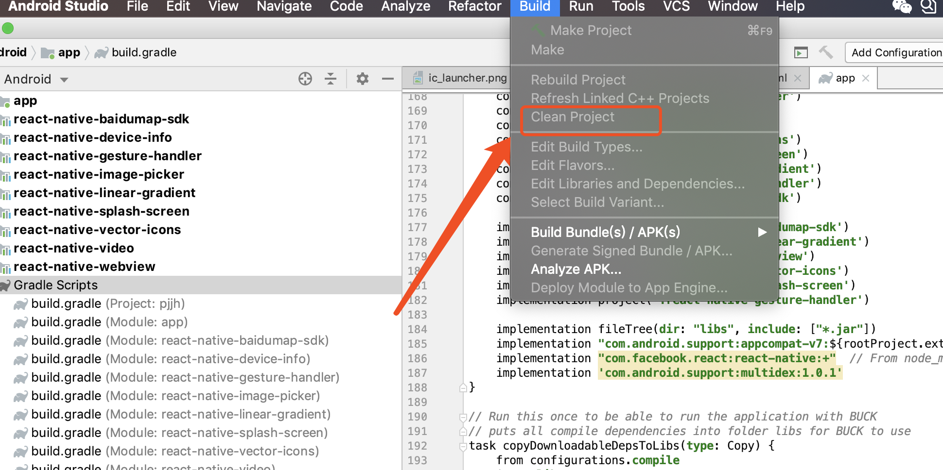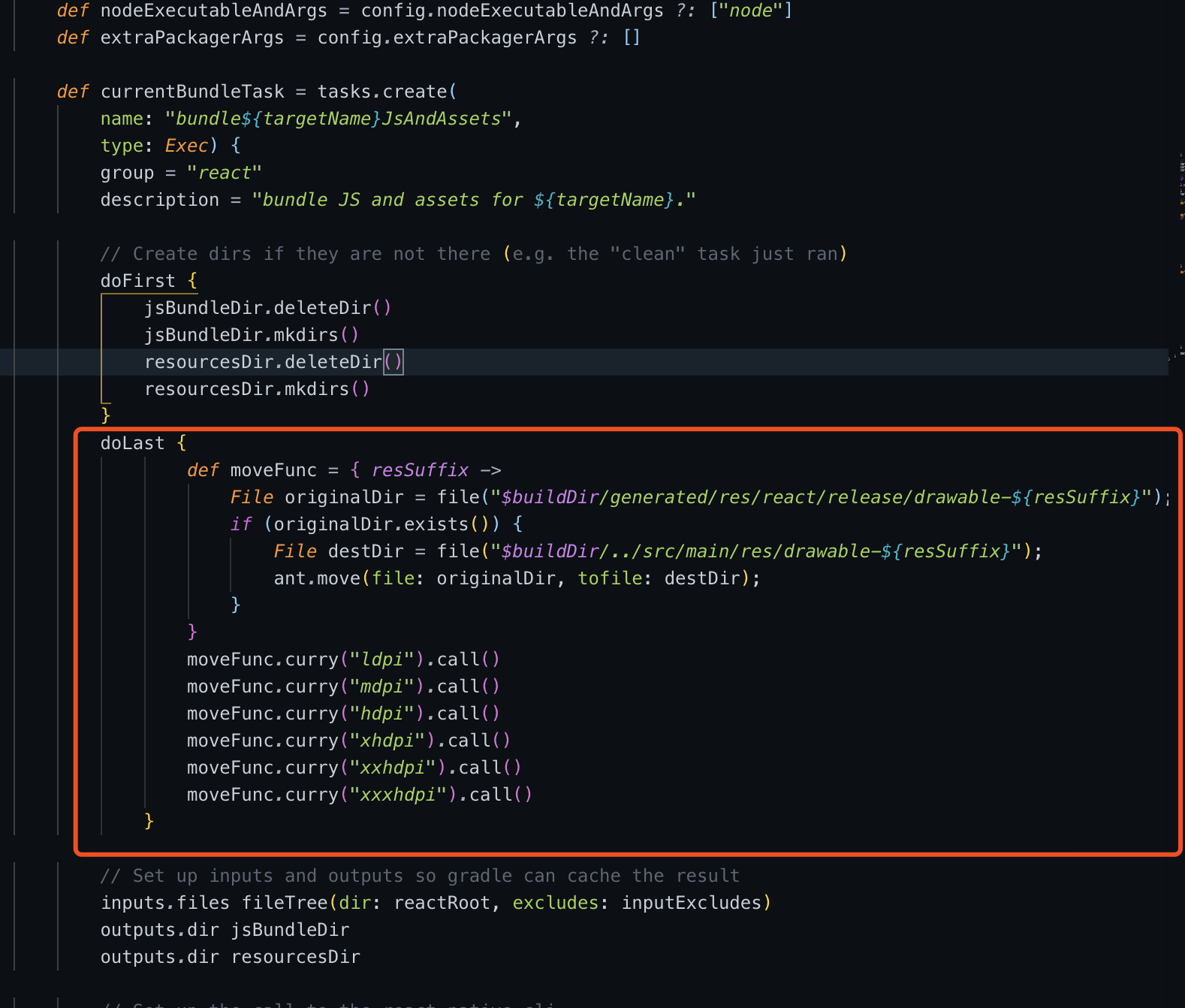 doLast { def moveFunc = { resSuffix -> File originalDir = file("$buildDir/generated/res/react/release/drawable-${resSuffix}"); if (originalDir.exists()) { File destDir = file("$buildDir/../src/main/res/drawable-${resSuffix}"); ant.move(file: originalDir, tofile: destDir); } } moveFunc.curry("ldpi").call() moveFunc.curry("mdpi").call() moveFunc.curry("hdpi").call() moveFunc.curry("xhdpi").call() moveFunc.curry("xxhdpi").call() moveFunc.curry("xxxhdpi").call() }看准位置 不是在doFirst块内 !!!