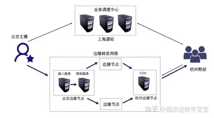 我们以开头的演唱会直播为例,来说明下它的逻辑。身在北京的主播媒体流会推到就近的边缘节点,在边缘节点直接进行转码,转码后的媒体流会分发到CDN边缘节点,当有用户访问时直接就近返回内容。基于边缘节点上的服务,直播流的上下行内容推送以及转码处理等都不用再回到位于上海的业务调度中心,大大降低了业务时延,身在杭州的粉丝的互动体验得到提升,同时边缘处理架构对带宽成本的节省也非常明显。