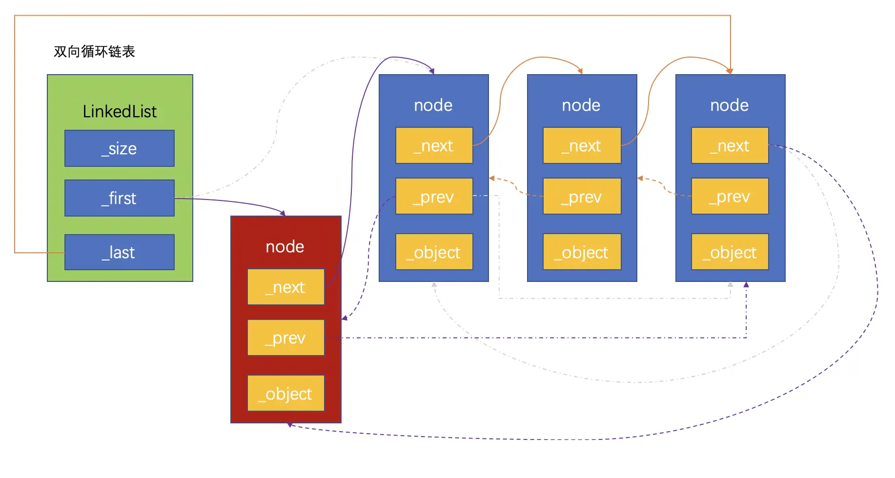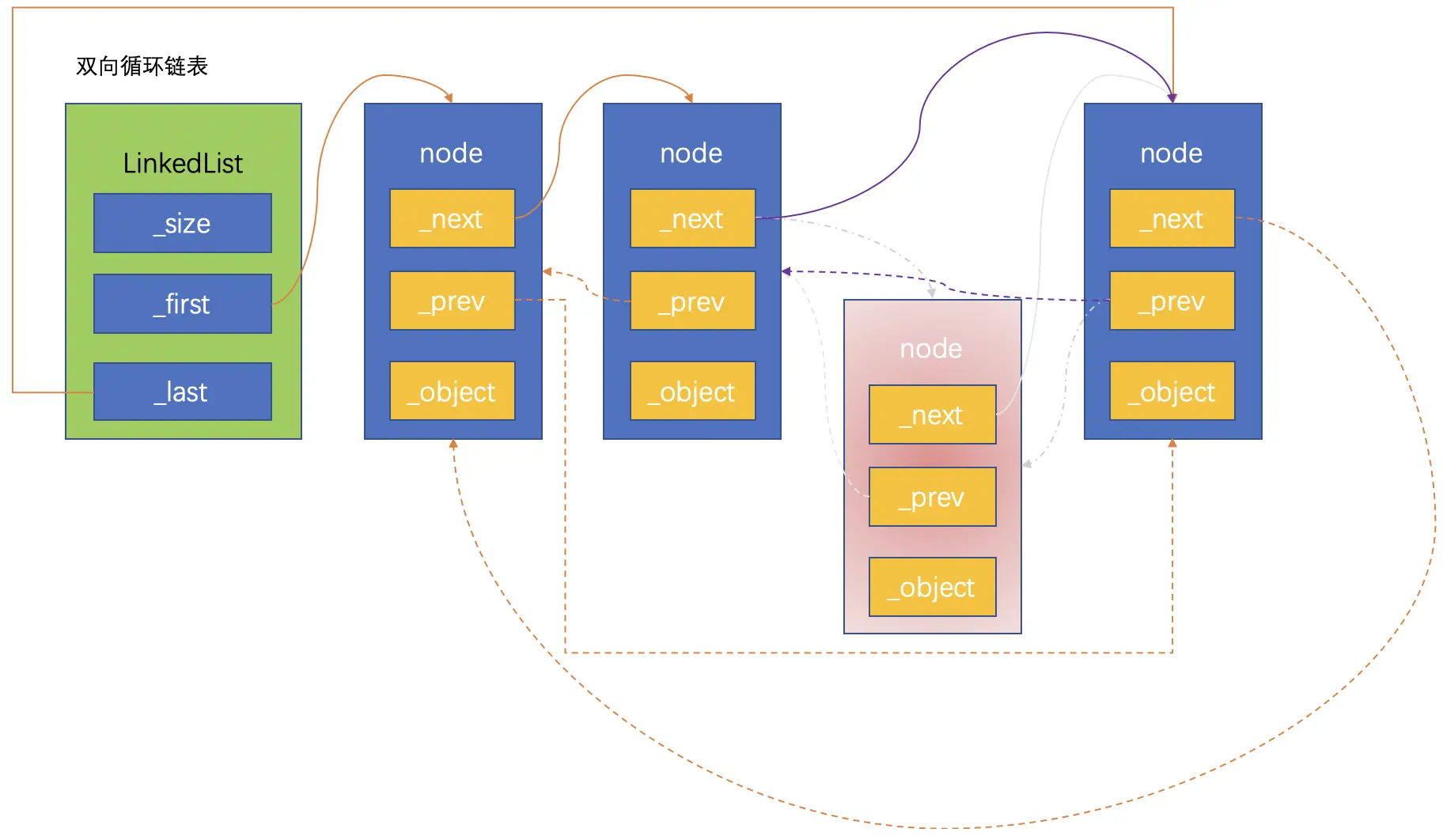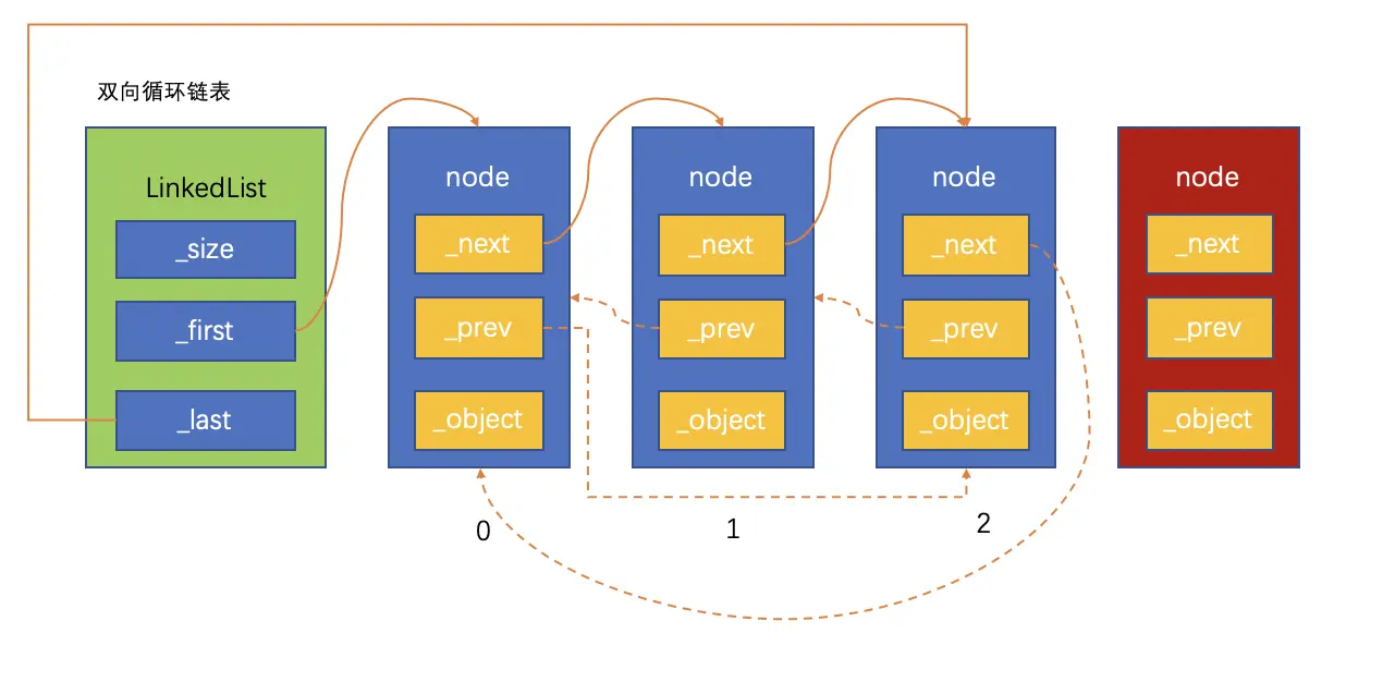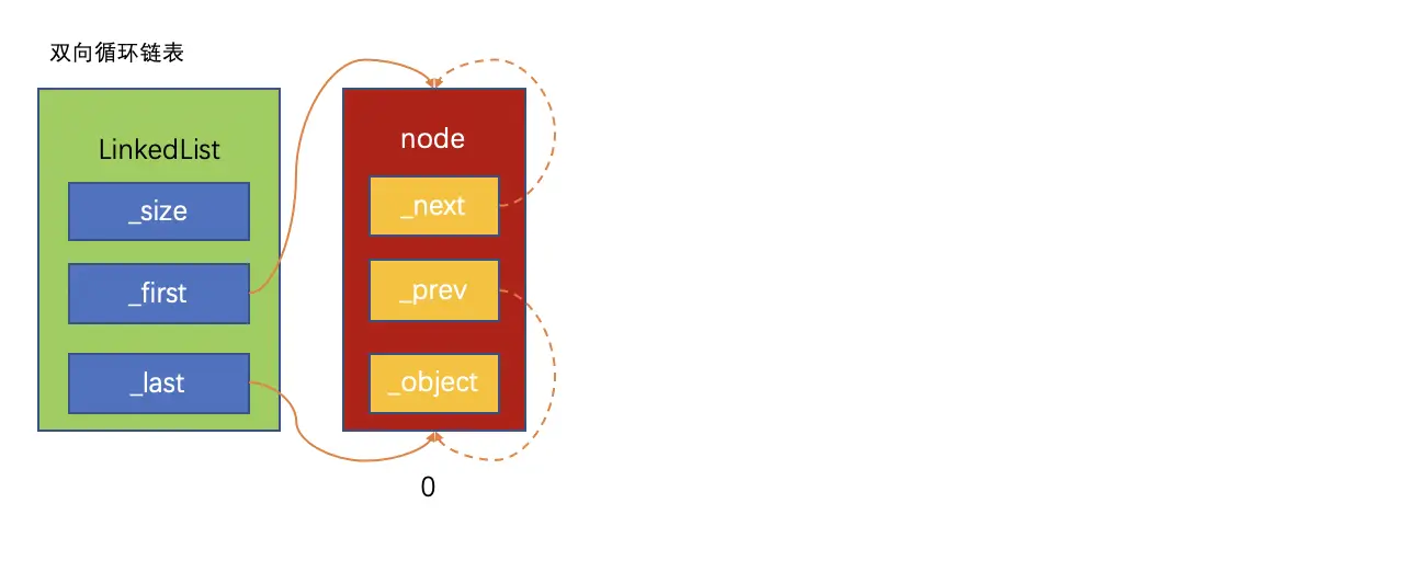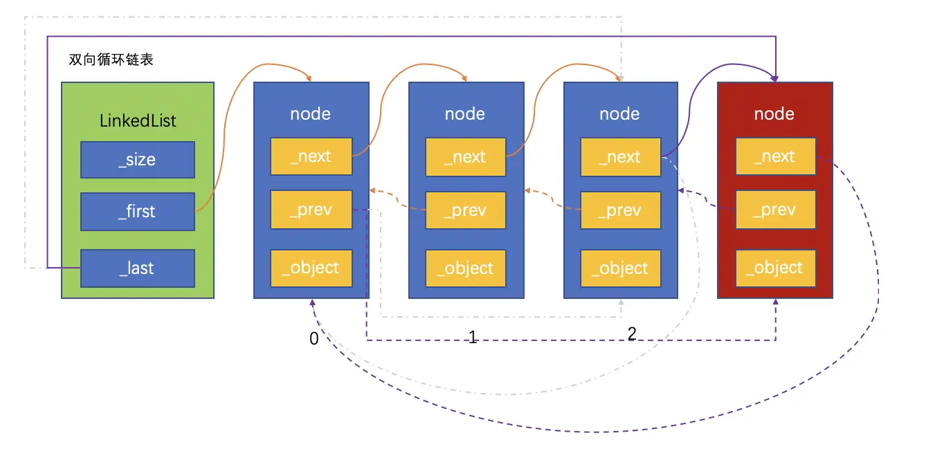 双向循环链表是单向循环链表的功能扩充,双向循环链表的原理和单向链表很相似:尾节点的next指向链表的头节点。在此基础上,头节点的prev指向尾节点,这样就实现了双向循环链表。同样,为了防止循环引用,尾节点指向头节点要用弱引用。