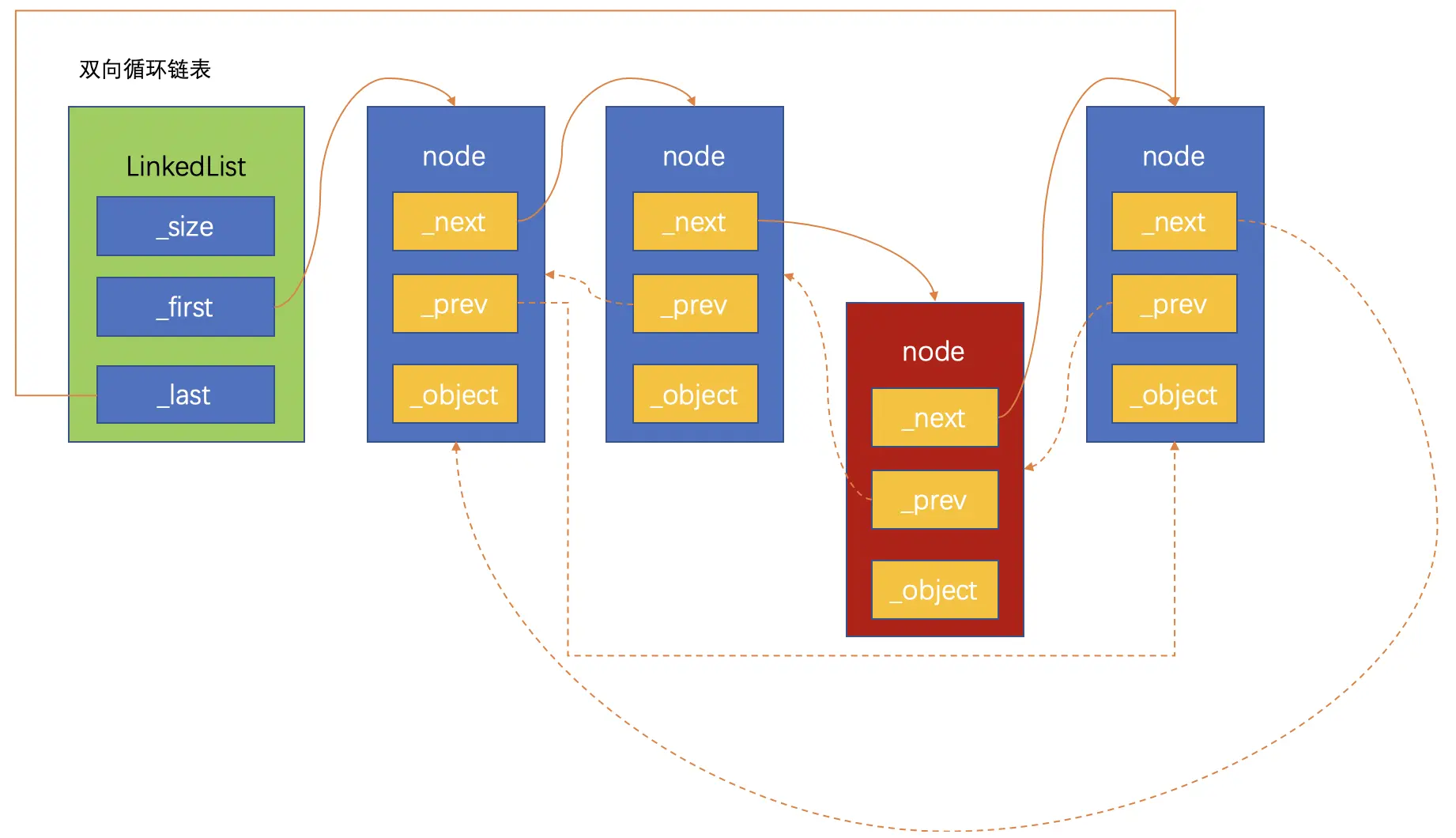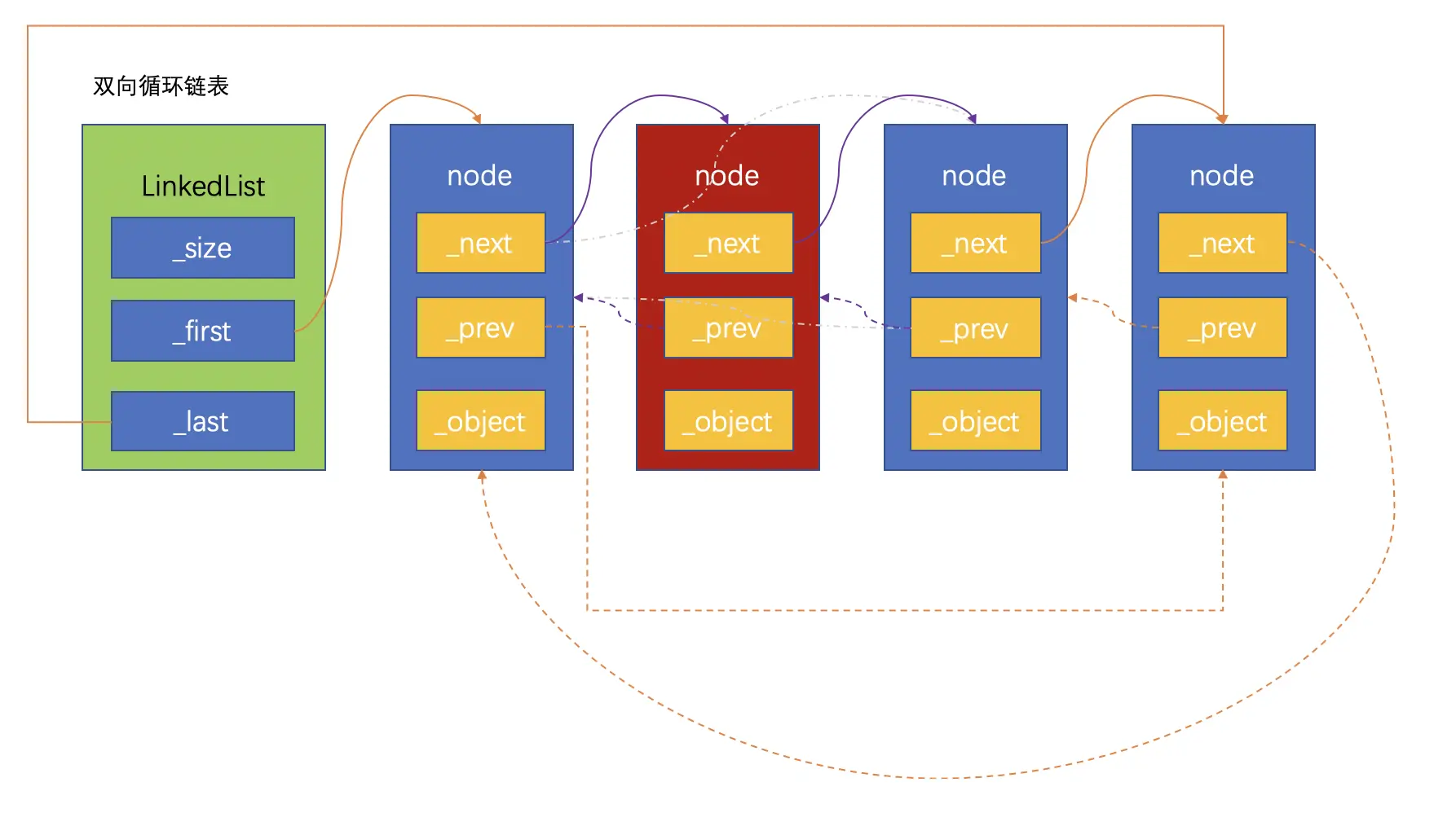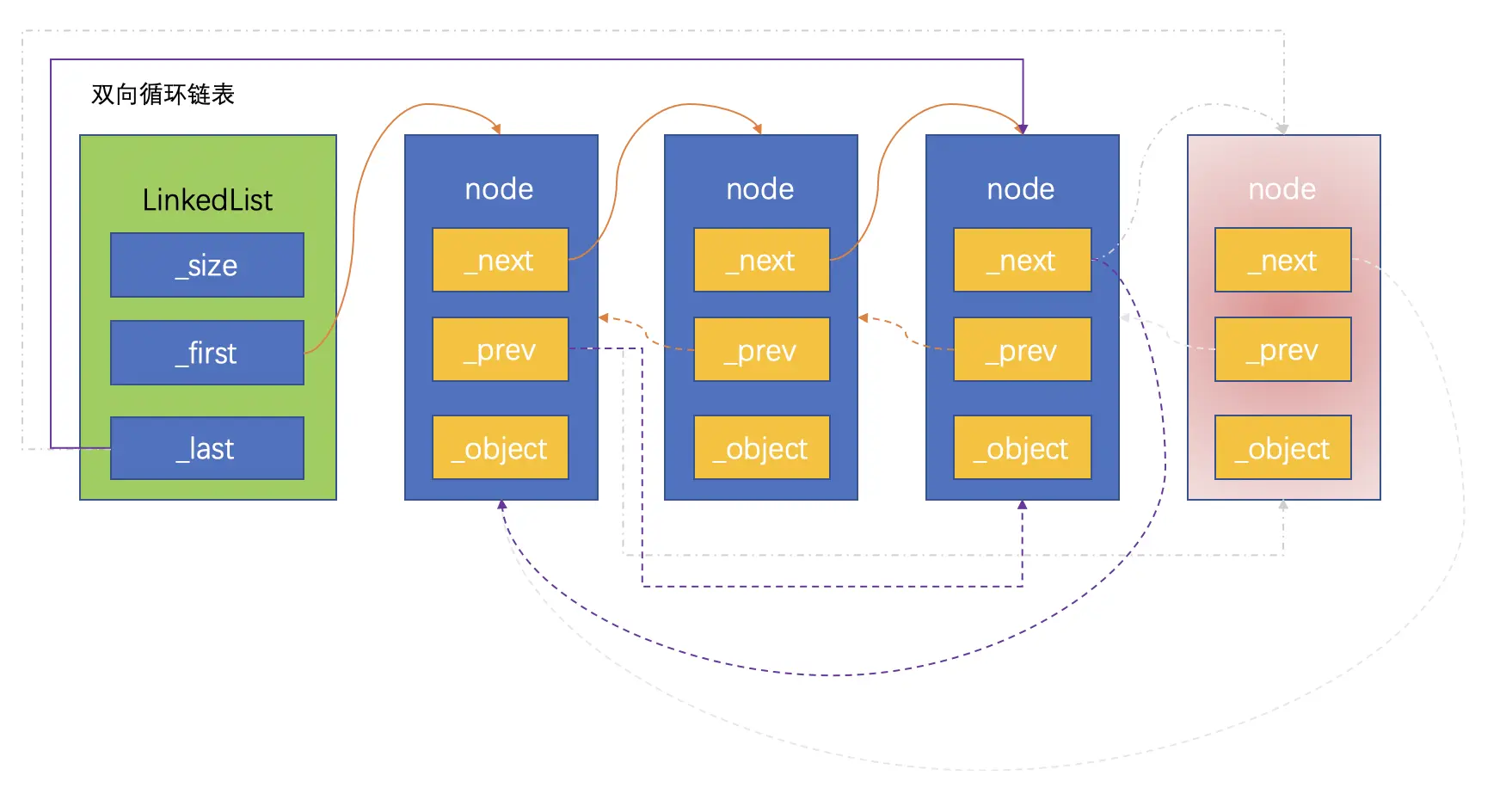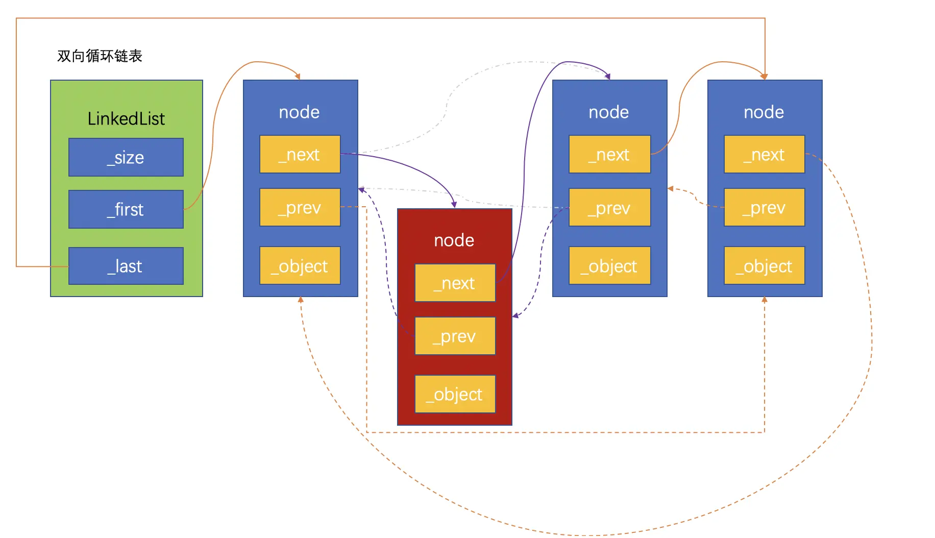 双向循环链表是单向循环链表的功能扩充,双向循环链表的原理和单向链表很相似:尾节点的next指向链表的头节点。在此基础上,头节点的prev指向尾节点,这样就实现了双向循环链表。同样,为了防止循环引用,尾节点指向头节点要用弱引用。