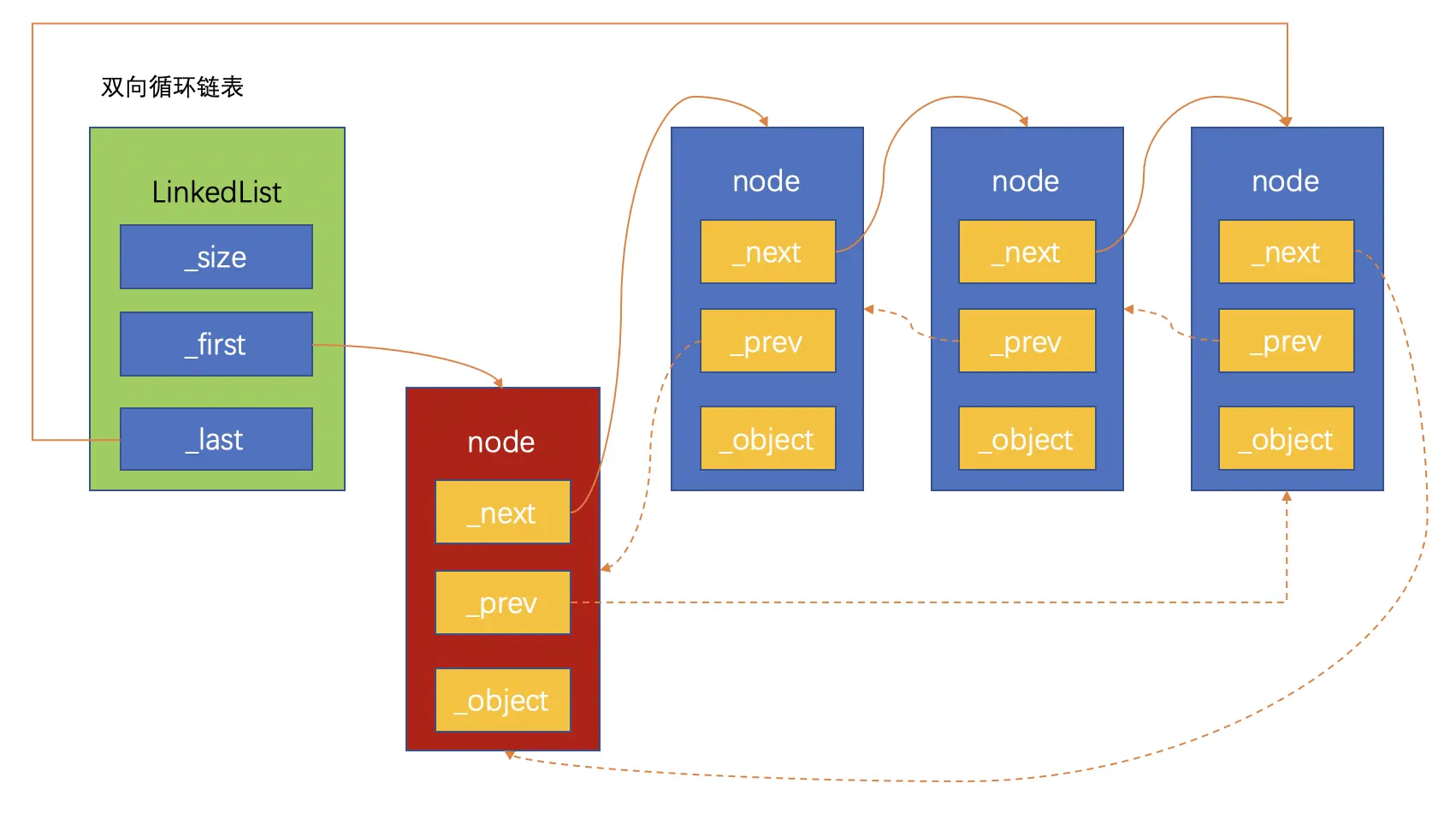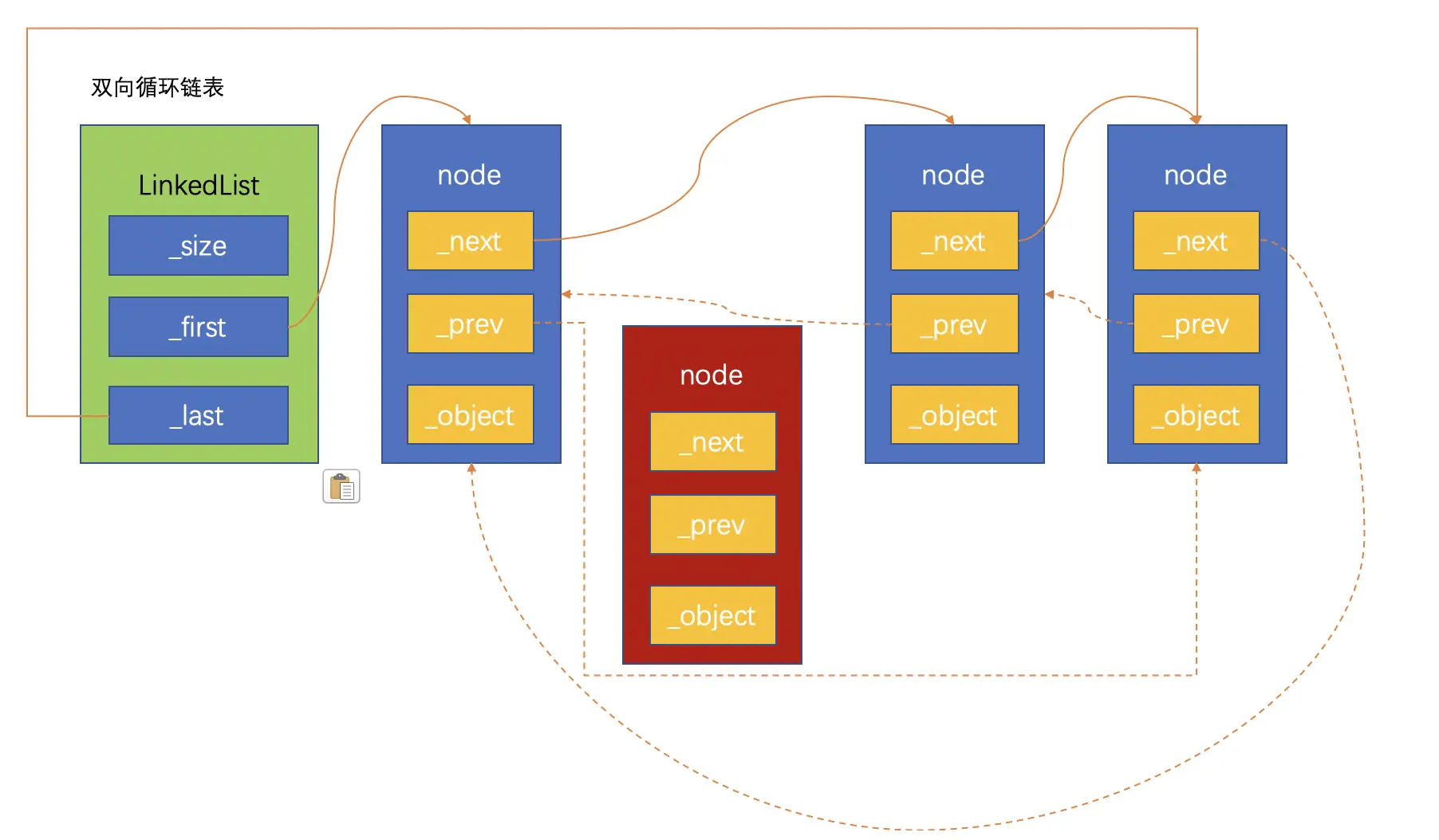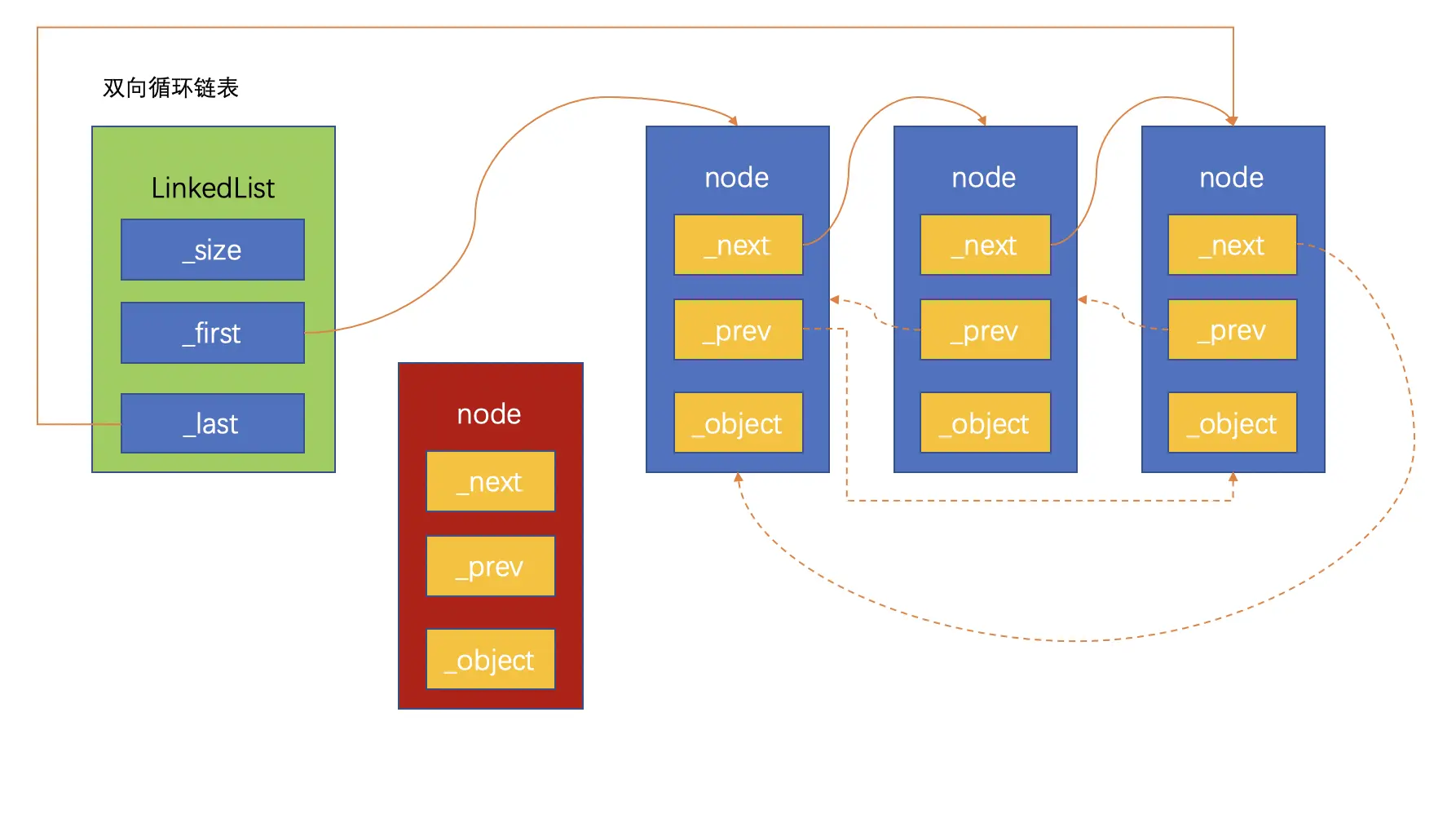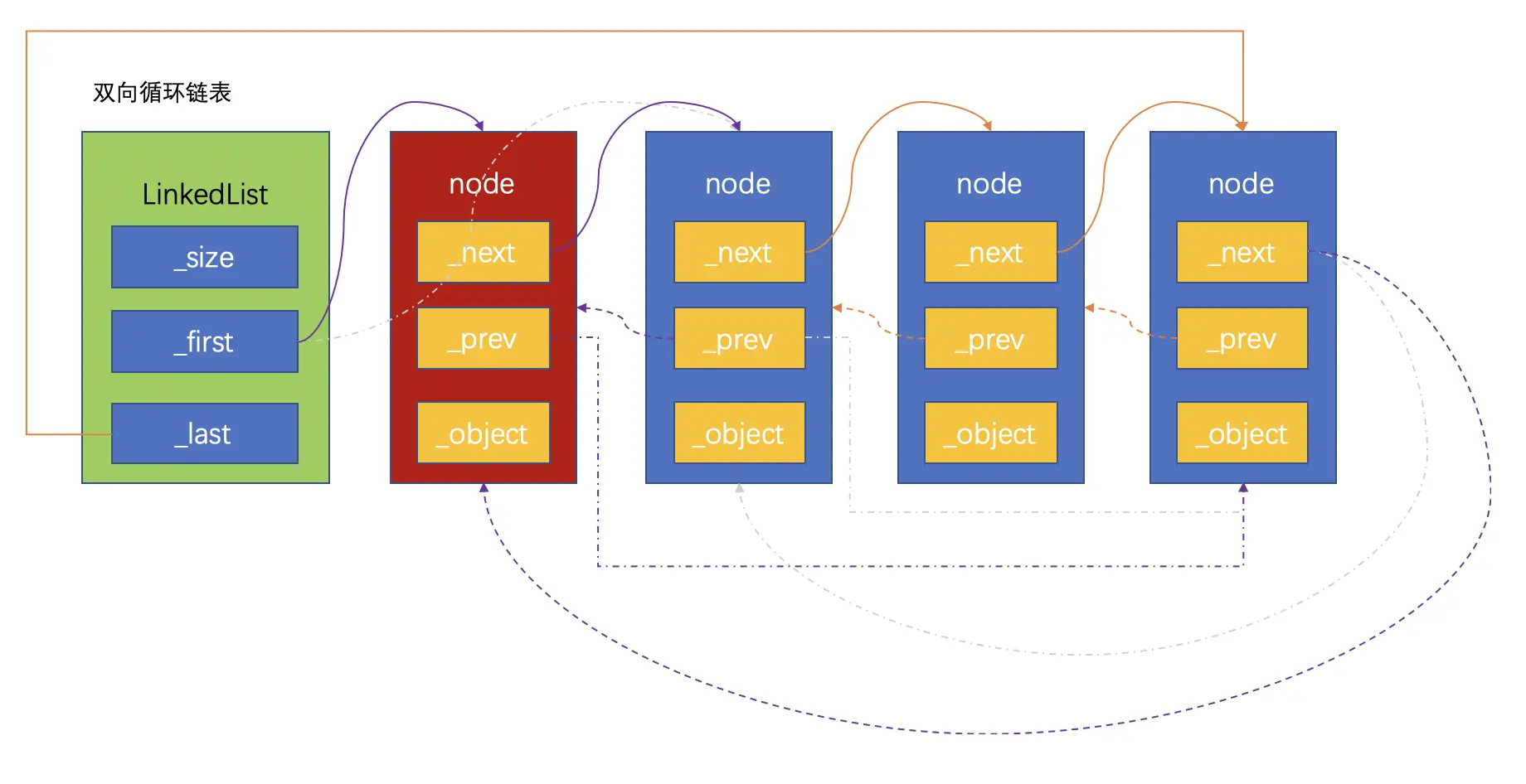 双向循环链表是单向循环链表的功能扩充,双向循环链表的原理和单向链表很相似:尾节点的next指向链表的头节点。在此基础上,头节点的prev指向尾节点,这样就实现了双向循环链表。同样,为了防止循环引用,尾节点指向头节点要用弱引用。