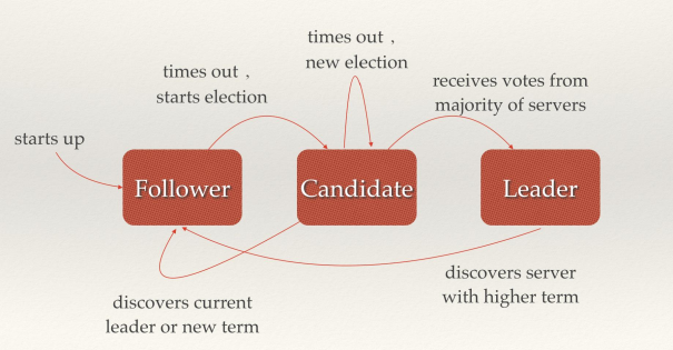 从拜占庭将军的故事映射到分布式系统上,每个将军相当于一个分布式网络节点,每个节点有三种状态:Follower,Candidate,Leader,状态之间是互相转换的,可以参考下图,具体的后面说。