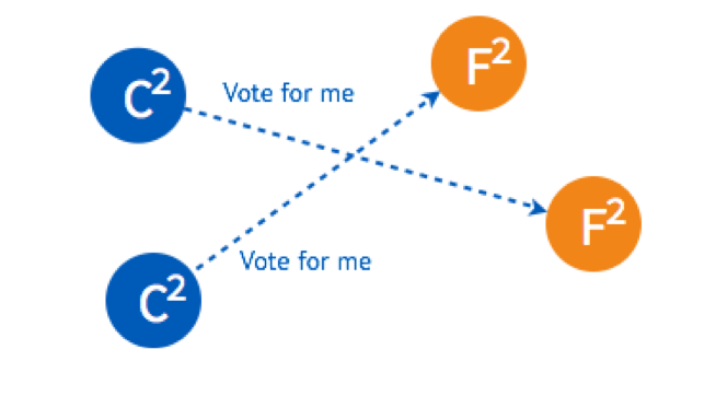 两个 Candidate 会分别给另外一个还没有给自己投票的 Follower 发送投票请求。
