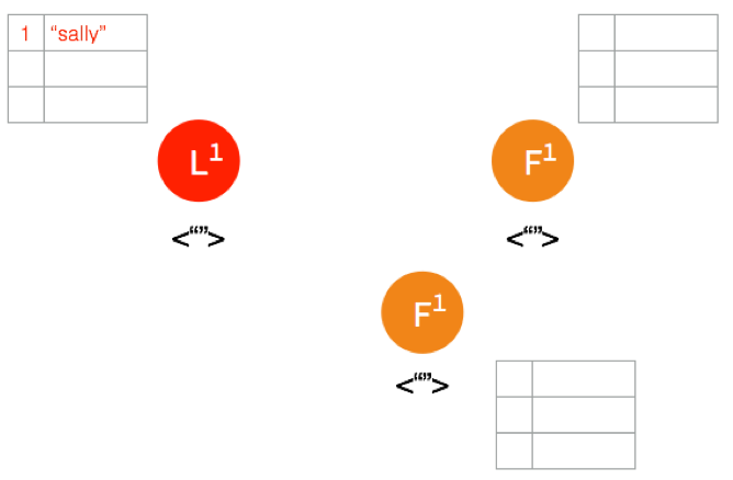 客户端发送请求给 Leader,储存数据 “sally”,Leader 先将数据写在本地日志,这时候数据还是 Uncommitted (还没最终确认,红色表示)