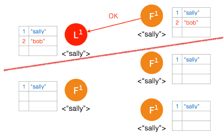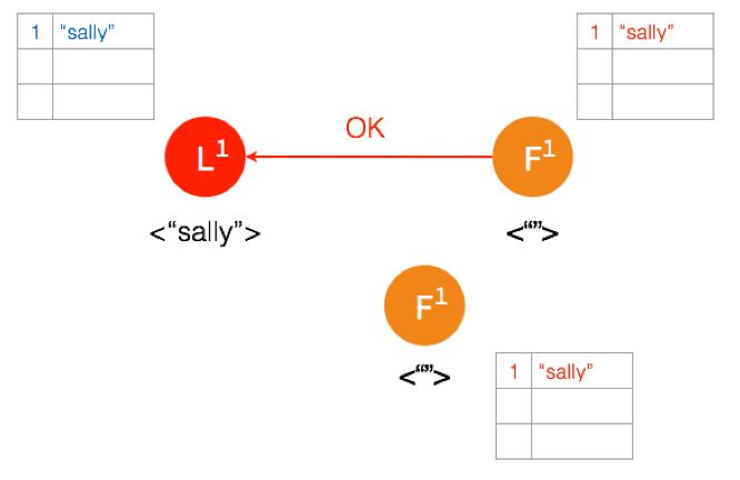 Follower 将数据写到本地后,返回 OK。Leader 收到后成功返回,只要收到的成功的返回数量超过半数 (包含Leader),Leader 将数据 “sally” 的状态改成 Committed。( 这个时候 Leader 就可以返回给客户端了)