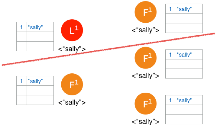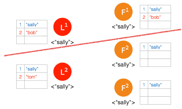Network Partition 将节点分成两边,一边有两个节点,一边三个节点。