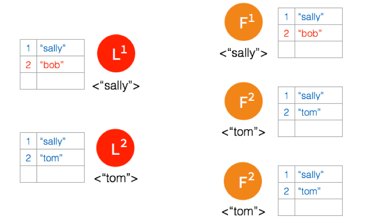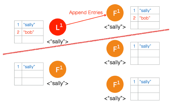 两个节点这边已经有 Leader 了,来自客户端的数据 “bob” 通过 Leader 同步到 Follower。
