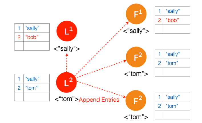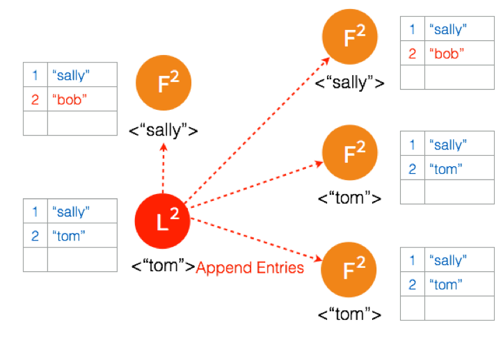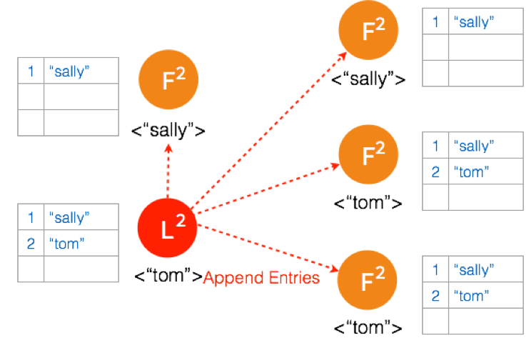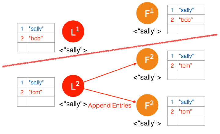 另外一个 Partition 有三个节点,进行重新选主。客户端数据 “tom” 发到新的 Leader,通过和上节网络状态下相似的过程,同步到另外两个 Follower。