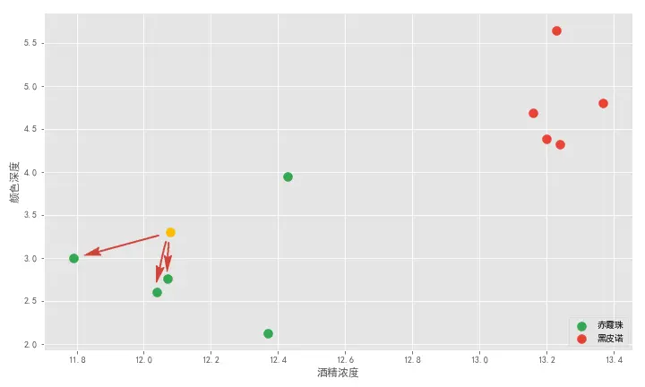 可以看到距离黄色点最近的 3 个点都是绿色的赤霞珠,与刚才肉眼观测的结果一致。