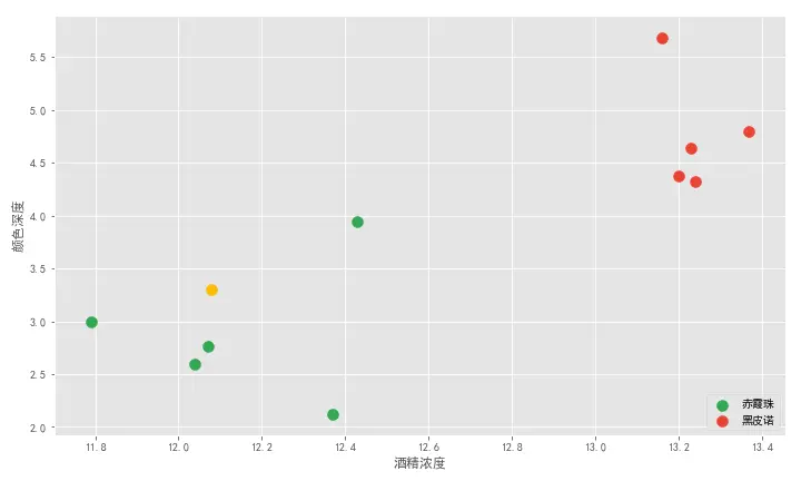 横轴是酒精浓度值,纵轴是颜色深度值。十杯酒在坐标轴上形成十个点,绿色的 5 个点代表五杯赤霞珠,红色的 5 个点代表五杯黑皮诺。可以看到两类酒有明显的界限。老板新倒的一杯酒是图中黄色的点。