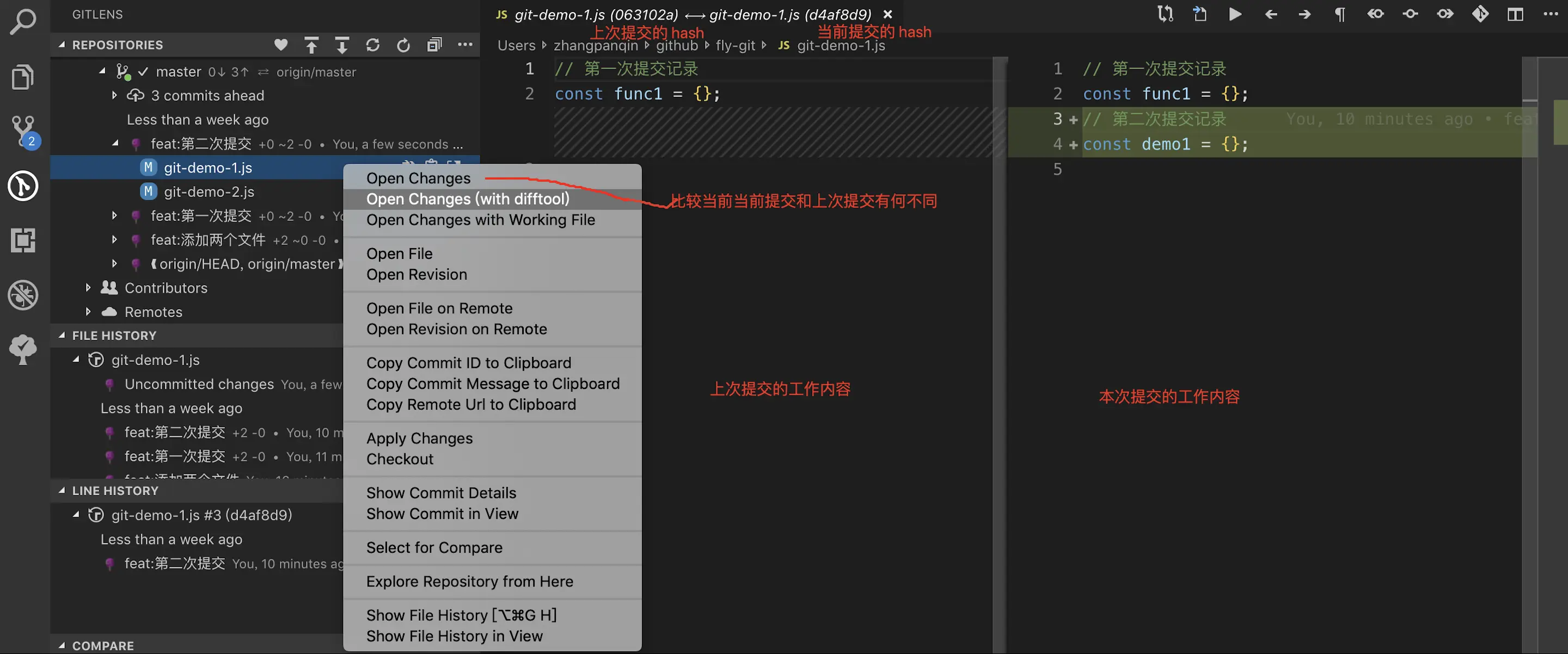 基于容易明白提交的差异,我习惯用 GitLens 查看。