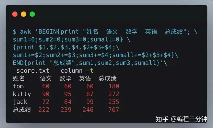 $ awk 'BEGIN{print "姓名 语文 数学 英语 总成绩"; \