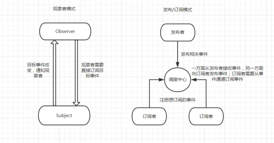 我画了一个大概的流程图,用来说明观察者模式和发布/订阅模式。如下: