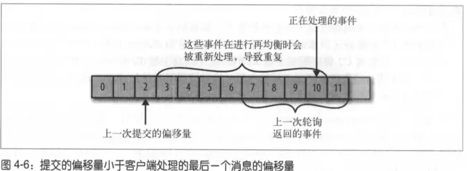 如果提交的偏移量小于客户端处理 的最后一个消息的偏移量 ,那么处于两个偏移量之间的 消息就会被重复处理,如图 4-6所示。