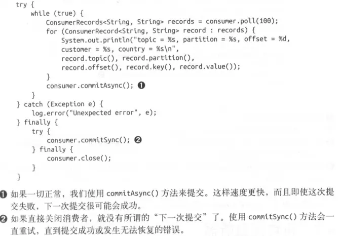因此,在消费者关闭前一般会组合使用 commitAsync()和 commitSync()。它们的工作原理如下(后面讲到再均衡监听器时,我们会讨论如何在发生再均衡前提交偏移量):