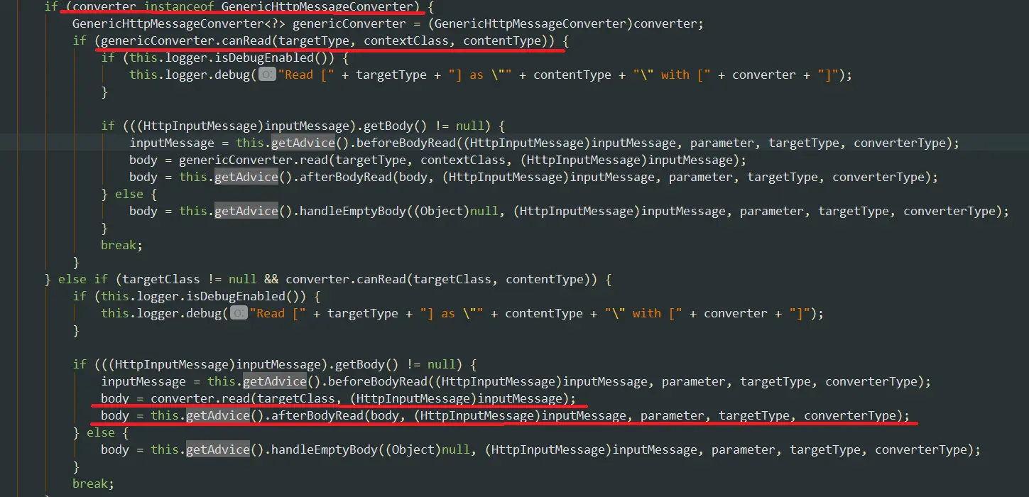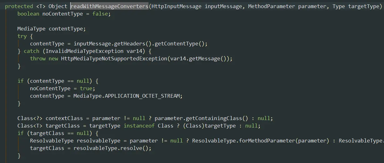 - @RequestBody 注解则是将 HTTP 请求正文插入方法中,使用适合的 HttpMessageConverter 将请求体写入某个对象; Spring中处理@RequestBody主要依靠的是AbstractMessageConverterMethodArgumentResolver这个类,它实现了HandlerMethodArgumentResolver(在另一篇文章中已经讲过).处理网络请求的方法是readWithMessageConverters这个方法(只截取了部分)。