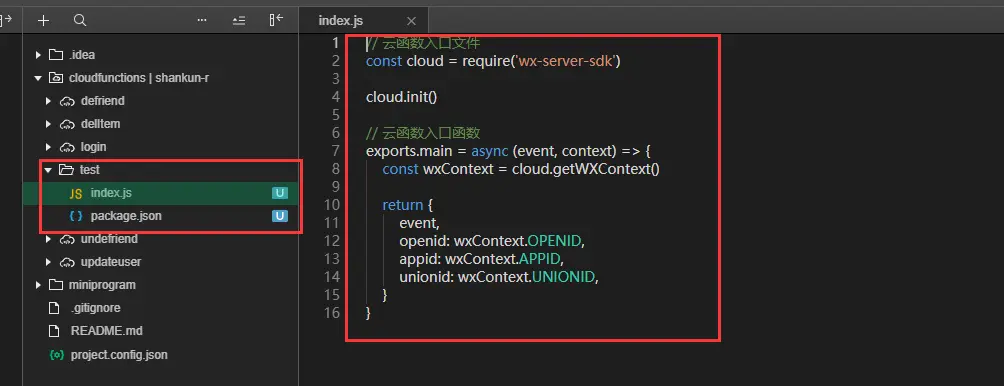 - 右键云函数根目录文件夹: 新建Node.js云函数,初始化如下