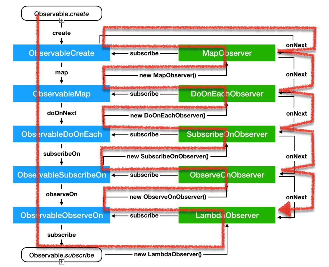 到此为止,我们可得知整个订阅过程是从下至上逆向的,下一级的Observable会生成一个Observer对象,与上一级的source进行订阅。