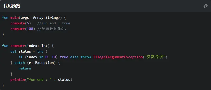 在 Kotlin 中 ,try 关键字引入了一个表达式,从而可以把表达式的值赋给一个变量。如果一个 try 代码块执行正常,代码块中最后一个表达式就是结果,如果捕获到了一个异常,则相应 catch 代码块中最后一个表达式就是结果