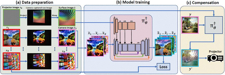 为了解决投影仪光学补偿问题,一般是用一个相机来拍摄大量的投影仪投射的图片,然后从这些拍到的和投射的图片对中拟合出一个光学补偿函数,再将要投射的图片经过这个光学补偿函数补偿,最后由投影仪投射,这样投射的补偿正好可以抵消非理想屏幕的颜色和纹理和投影仪本身的非线性光学特性。
