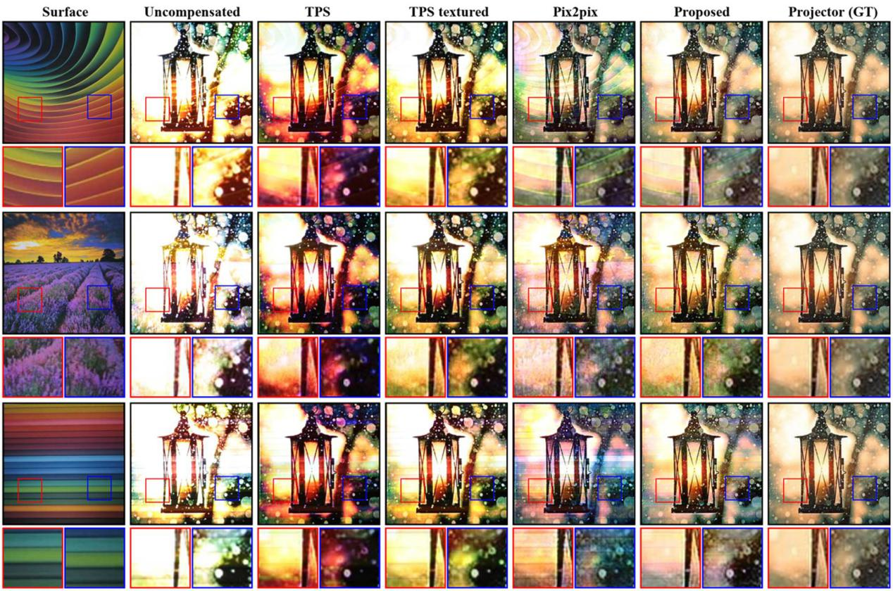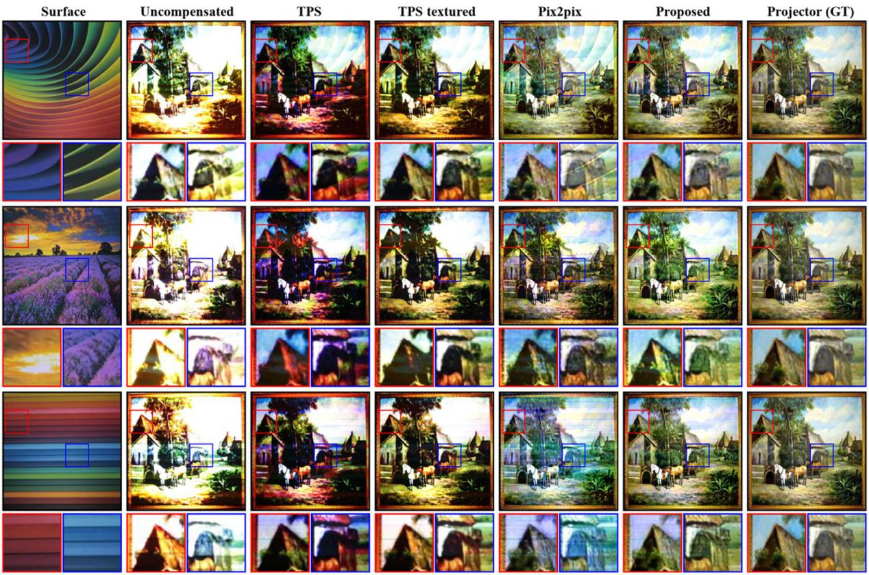 图4. 相机拍摄的补偿效果比较。第一列:投影仪屏幕表面纹理。第二列:相机拍摄的未补偿效果。第三到第六列,相机拍摄的不同补偿方法补偿后的效果。第七列,投影仪的输入,即想要用户看到的效果。