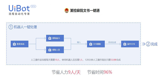 如今,美国各联邦政府部门都在积极推动数据工作方面的RPA应用。从2017年起联邦政府首个RPA的正式运行,到2018年的几十个试点项目顺利开展并最终完全成型,不难看出,美国政府对RPA的关注与需求提升显著。 实际上,目前国内也有一些单位或部门开始选择应用RPA,并从中获益。例如某检察院就将RPA技术应用到了司法办案领域,实现了法律文书开具的自动化,解决了以往法律文书开具中耗时费力和易错出乱两大难题。UiBot机器人的应用,使得原来120分钟的人工操作如今只需5分钟即可完成,而文书开具的准确率高达百分之百。