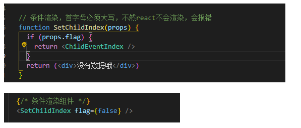 - 条件渲染,首字母必须大写,不然react不会渲染,会报错,函数的首字母也要大写