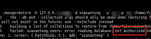./mongorestore -h 127.0.0.1:xxxxx -d xiaoantong -u name -p psd /home/file/dbName
