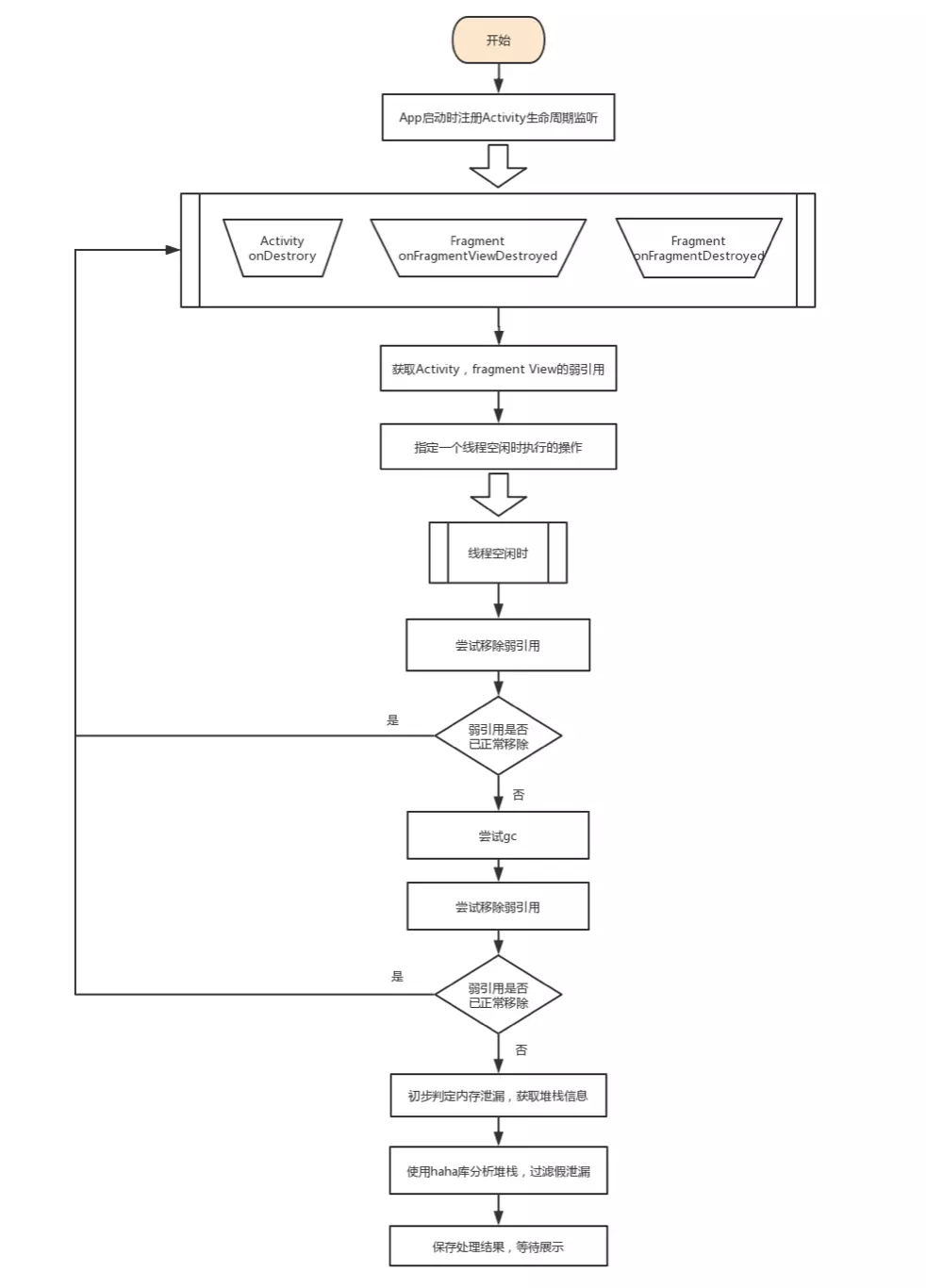 对于工作原理我相信大家应该也是或多或少有一定了解,这里刚好有一张非常不错的流程图就直接借用过来了,另外他从源码角度理解 LeakCanary 的这篇文章也写的非常不错,感兴趣的点击文章底部的链接直达。