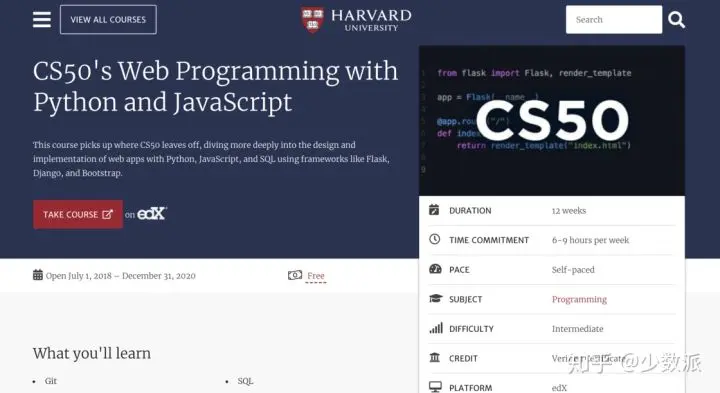 CS50's Web Programming with Python and JavaScript 是 CS50 系列中的网页开发课程。课程讲解了网页开发三剑客 HTML,CSS 和 JavaScript,同时也会涉及 Python 的讲解和用 Flask 框架进行网页开发,以及使用 SQL 和建立数据库的相关细节,还会讲到 Git 和 GitHub 的相关操作。主讲人是 Brian Yu,他也是 CS50 主课的首席 TF,上课逻辑清晰,几乎没有废话。