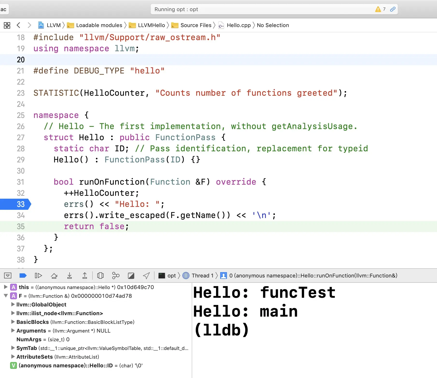 以上是属于 Xcode 的实时调试,还是很方便的。通过对 Scheme 的配置,我们也能看出来,我们运行 opt 的目的就是触发 Pass 的功能,所以在
