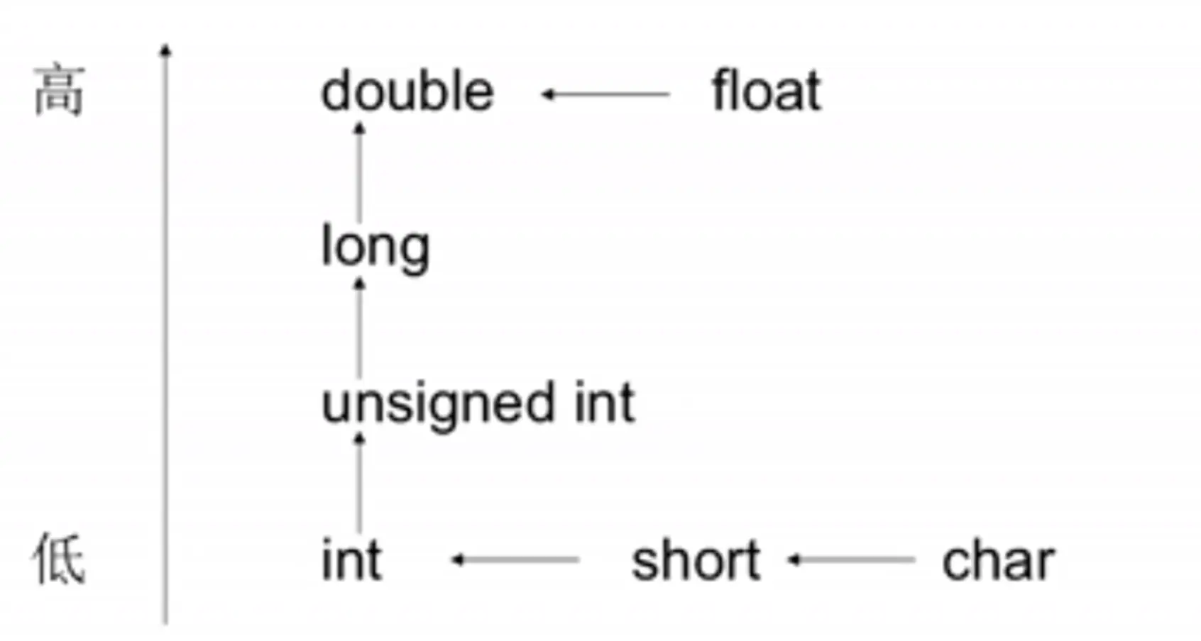 - 长字节的类型向短字节的类型赋值转换时,会发生截断,如 int -> char 时,会把 int 的低位字节保留,超过 char 长度的高位字节丢弃。