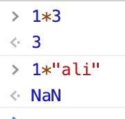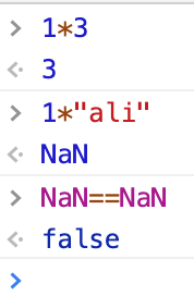 由于这个表达式做的是数值运算本来期望的是产出一个数值,但是由于我们乘了一个字符串导致运算的失败,当然不会运算出我们想要数值的这种结果,于是结果就是“NaN”,即“Not a Number”,这种情况多发生与你忘记把字符串类型转化成数值类型,但是还是“自信满满的”进行计算了,NaN本身有两个特点:首先NaN与任何值都不相等,包括与NaN本身