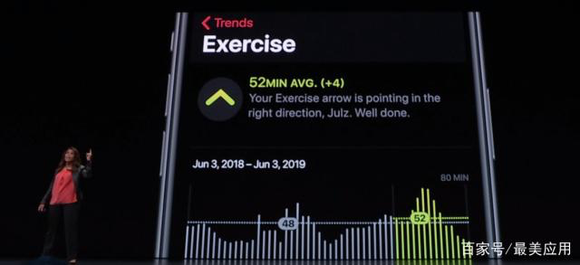在健康和健身方面,watchOS 6的健身记录应用当中新增了趋势(Trends)功能,可以对用户在一段时间内的运动数据进行统计和计算。