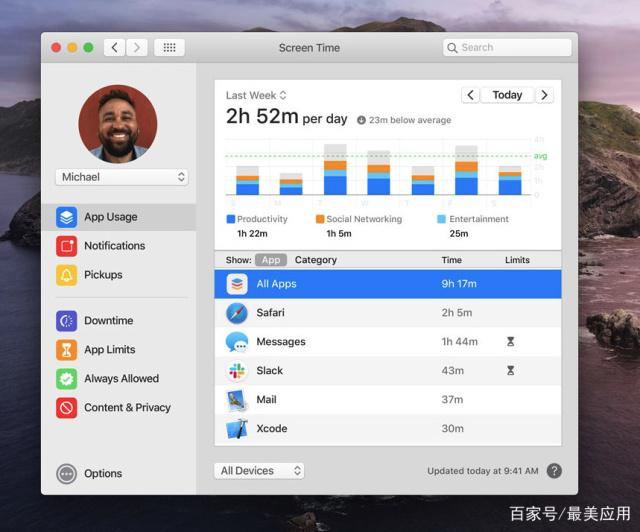 iOS 12 中 苹果加入了屏幕使用时间,来监测和提醒用户的手机使用时长和习惯,现在这个功能也加入了 macOS,可以方便用户来了解自己每天用电脑的时间和习惯; 同时也可以用来限制自己电脑前待着的时间,保护视力和身体健康。
