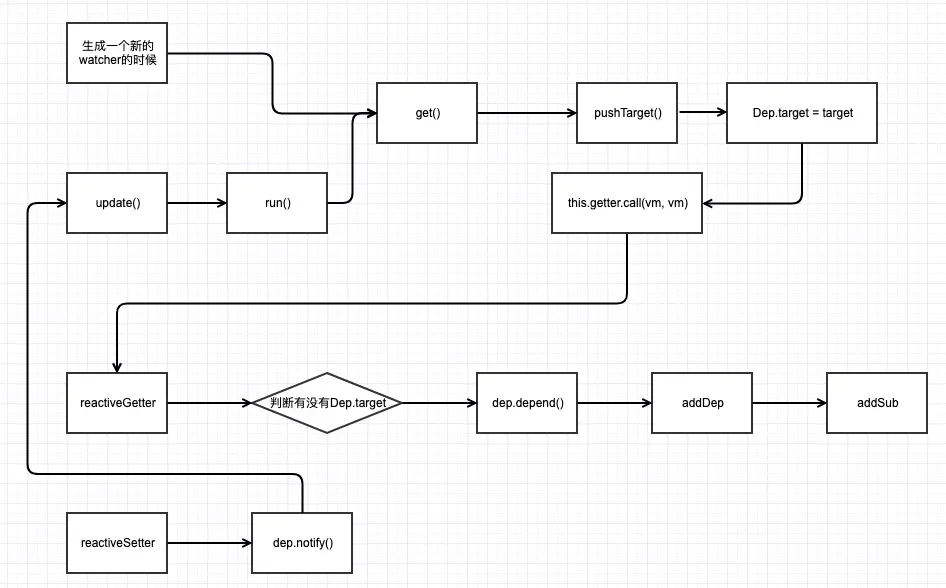 上述流程中,当生成一个新的renderWatcher的时候,便会走get流程,然后进行依赖收集,如果没有Dep.target,说明这个值并没有对应的watcher,所以不需要进行依赖收集。 当更新的是时候,又回进行一次依赖收集。