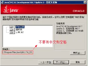 注意:安装JDK路径不要包含中文 默认是安装到了 C:\Program Files\Java\jdk1.7.0_0\目录下,可以通过“更改”按钮对安装路径进行自定义。可以换一个安装路径,例如:d:\Java\Jdk\jdk1.7.0_03 下一步。